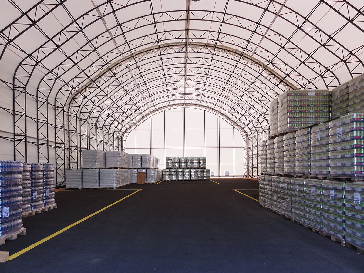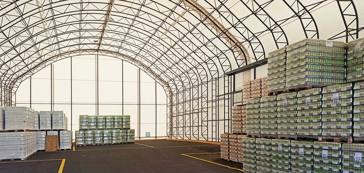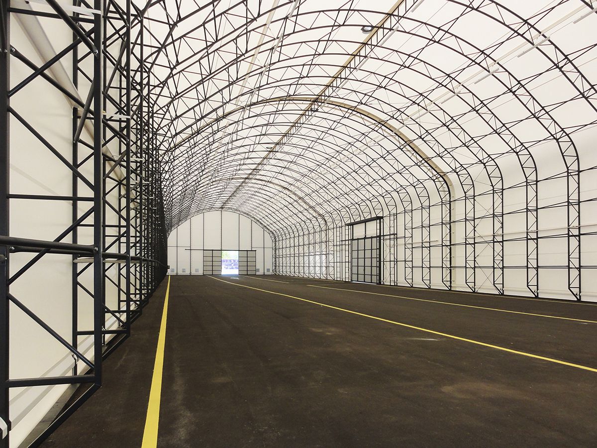 Die montierte Konstruktion der Hallen 20 × 80 m und 20 × 40 m mit einer Seitenhöhe von 6,5 m und einer Firsthöhe von 12,6 m besteht vollständig aus einem Fachwerkrahmen in Form eines umgedrehten Buchstabens U.