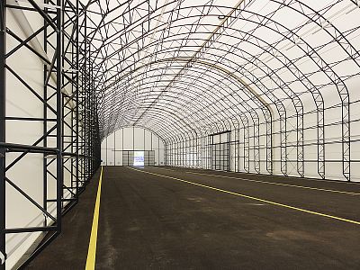 Táto hala bola postavená na existujúcom asfaltovom podloží s doplnením úpravy proti zatekaniu vody do haly. V čele aj boku haly sú umiestnené dvojkrídlové posuvné vráta, opláštenie haly je realizované bielou textíliou s plošnou hmotnosťou 900 g/m2.
