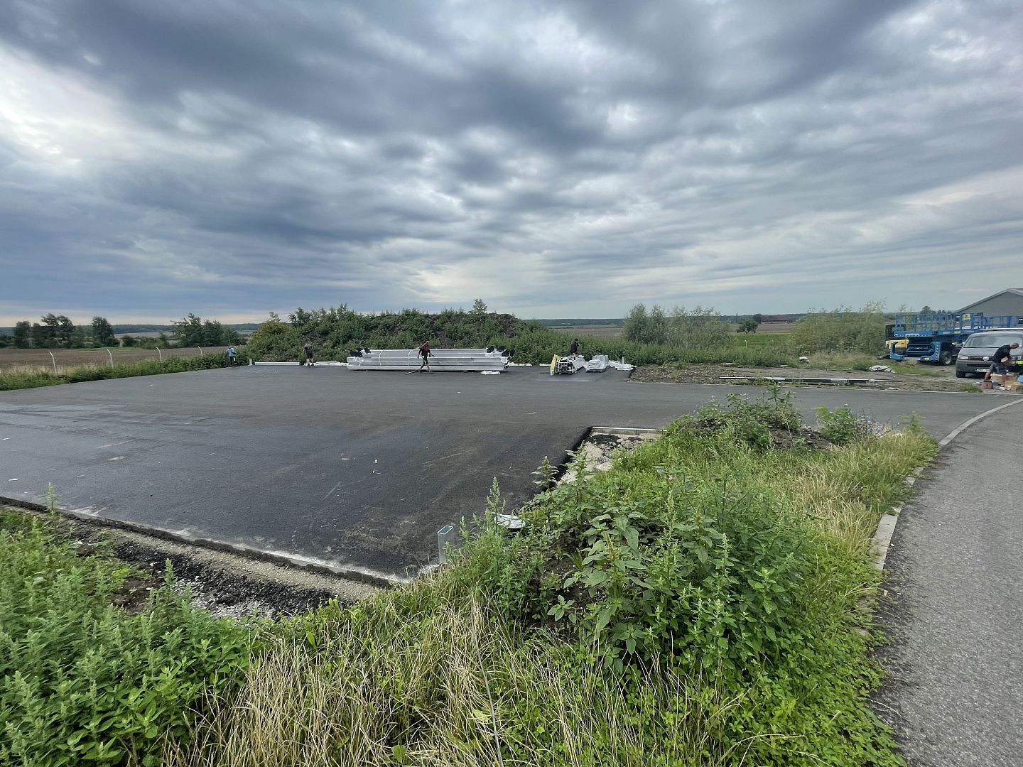 Ľahká stanová hala slúžiaca ako zastrešenie pre drevené palety.